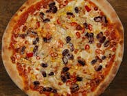 Sos pomidorowy(baza do pizzy), Ser mozzarella, Kurczak- grillowana pierś, Czerwona cebula, Kukurydza, Fasola czerwona, Oregano -