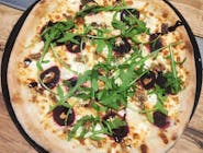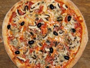 Sos pomidorowy(baza do pizzy), Ser mozzarella, Szynka biała, Grillowana cukinia, Oliwki czarne, Pomidorki koktajlowe, Ser feta, Pieprz czarny grubo mielony -